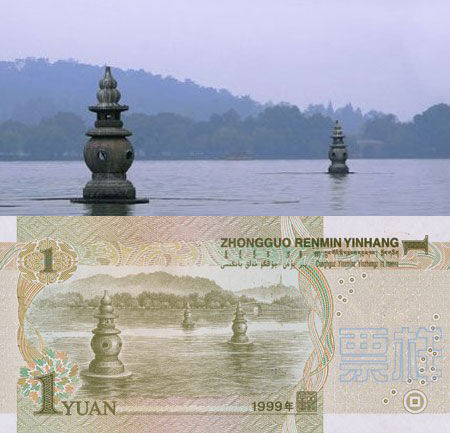 “三潭印月”是我们日常生活中最常见、“接触”最多的风景,因为它出现在第五套人民币面值1元的钱币上。三潭印月是杭州西湖的标志性景观,是江南园林“自然风光与人工建筑结合”的典范。西湖中的这三座小石塔被称为“三潭”,秋节时,在塔中点燃灯烛,灯光、月光以及它们在湖水中倒影交相辉映,是中国古典园林的经典之作。人民币上的图案并非完全写实,摄影师所在角度只能拍到两座石塔。
