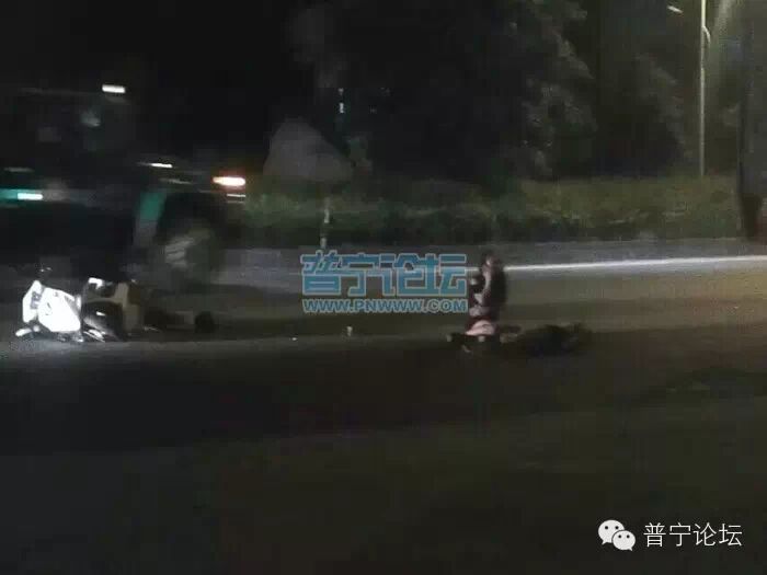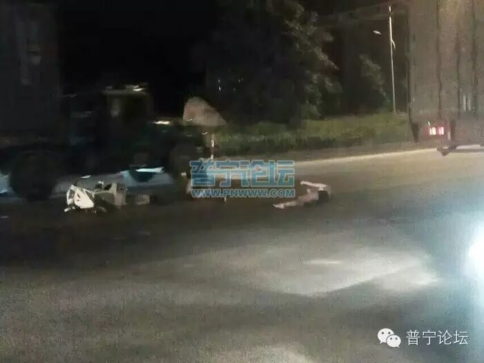 16日晚,揭阳普宁大道大南山路口又发生“鬼火”摩托车车祸的事故,图片转自QQ空间,图片中可以看到一辆白色的“鬼火”摩托车倒在道路中间,一名女子躺在地上生死不明,怀疑是女子同伴的男子蹲在旁边打电话,是否受伤未知。目前事故原因仍不清楚。