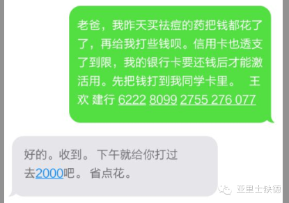 姜丽是个大二的学生,同样的也参与过这类关注群发领奖励的活动。在参与后的半个月,姜丽的爸爸收到了“姜丽”发来的短信,短信内容是这样的: